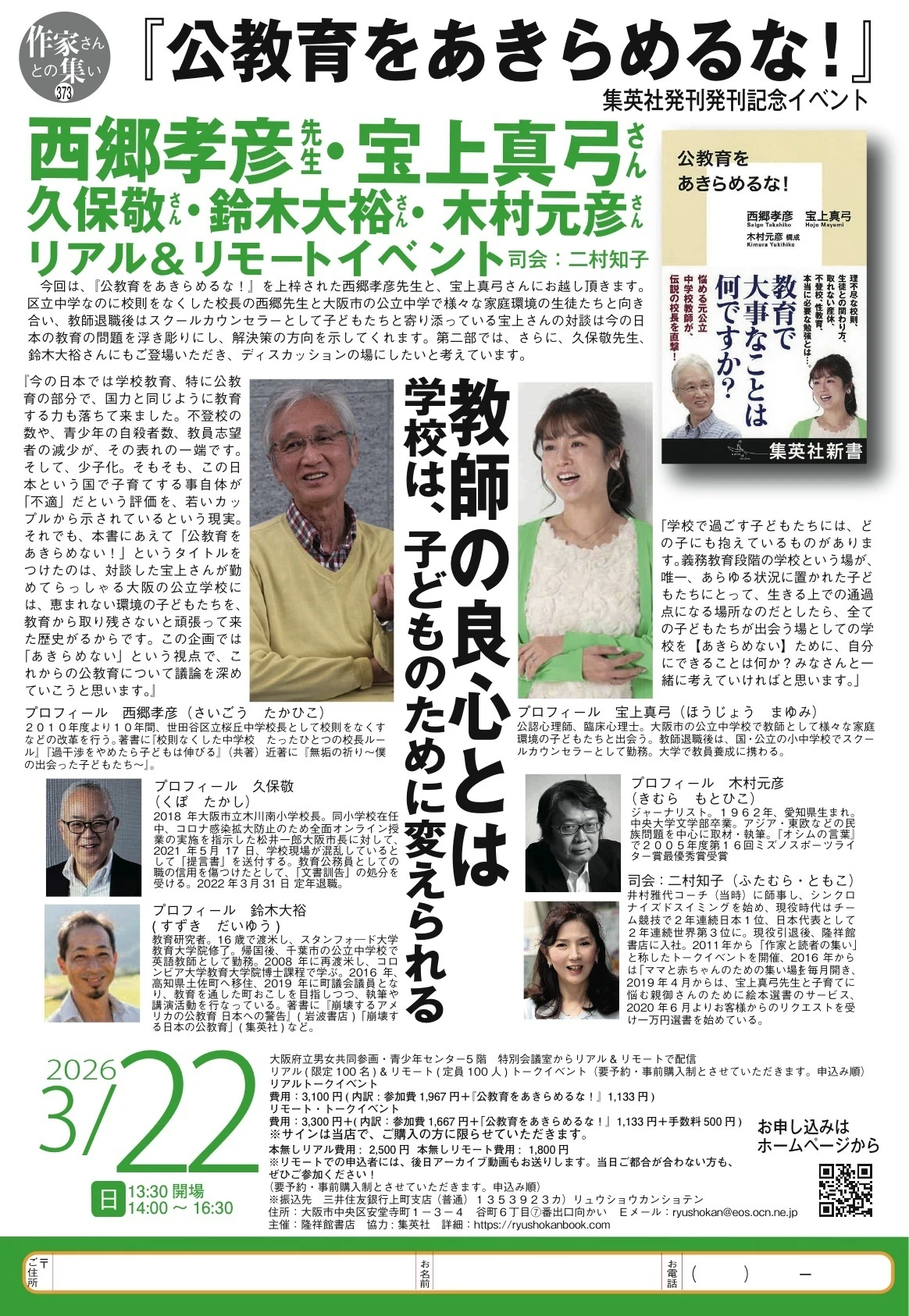 3/22(日)に、新書『公教育をあきらめるな!』の刊行を記念し、大阪・隆祥館書店にてトークイベントを開催いたします。
