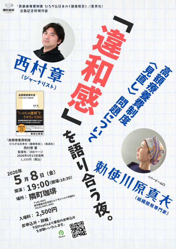 西村章×勅使川原真衣「高額療養費制度〈見直し〉問題について「違和感」を語り合う夜」【『高額療養費制度 ひろがる日本の〈健康格差〉』(集英社)刊行記念イベント】 | Peatix